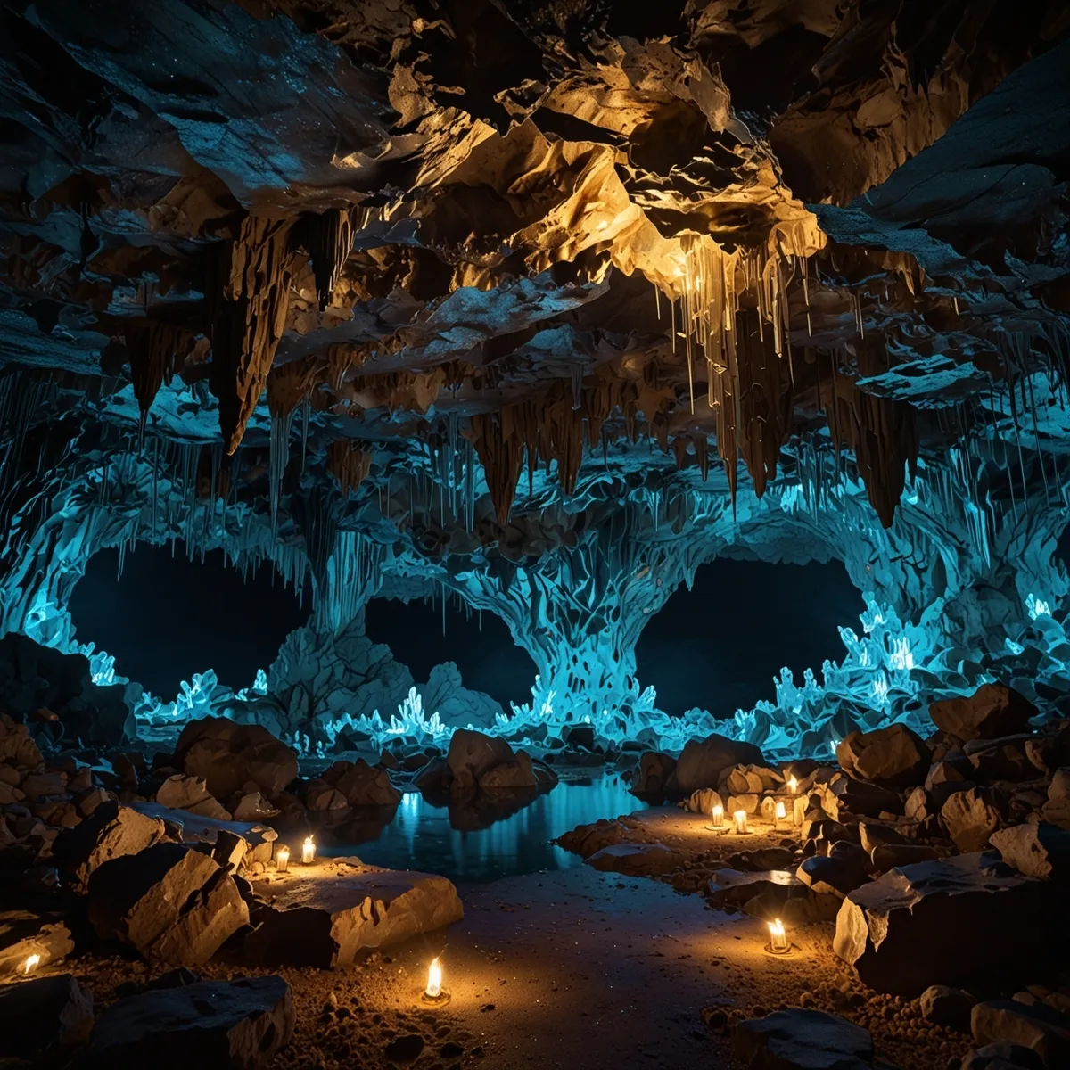 Shimmering Crystal Cave with Luminescent Streams and Hidden Treasures