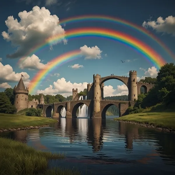 Fantasy Landscape with Rainbow Bridge and Floating Castle