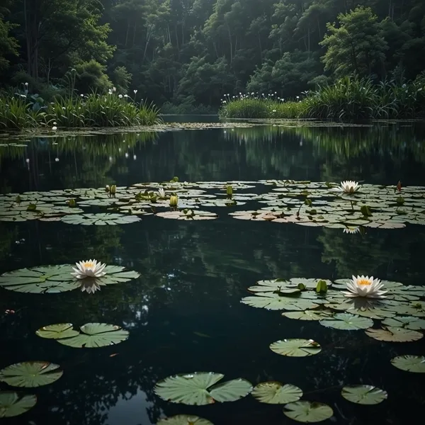 Serene Lake with Floating Lily Pads and Hidden Mermaid Kingdom