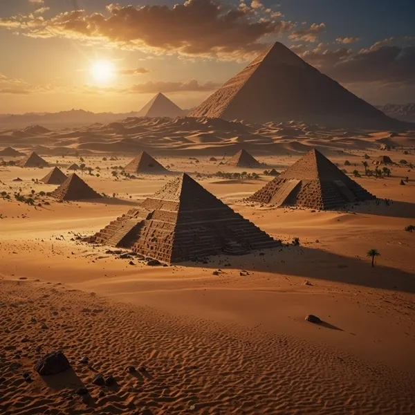 Vast Desert with Ancient Pyramids and Glowing Oasis