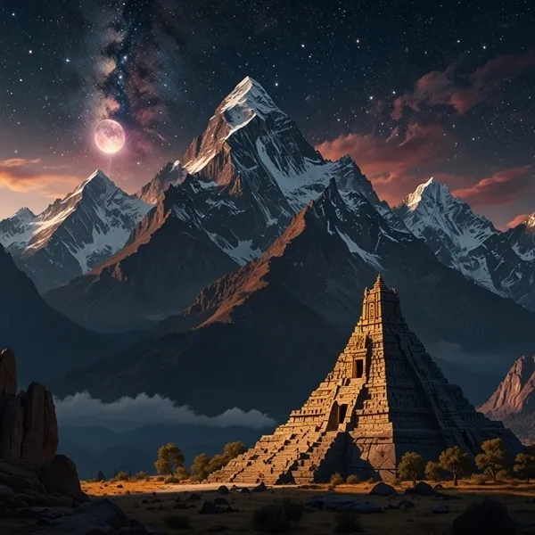Celestial Mountains with Floating Crystals and an Ancient Temple